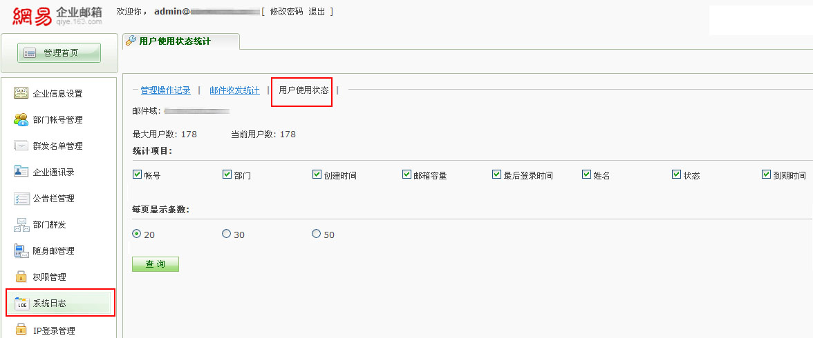 可根据帐号、部门、创建时间、邮箱容量、最后登录时间、姓名、状态、到期时间显示用户使用状态。查询结果可以导出为CSV格式的表格。